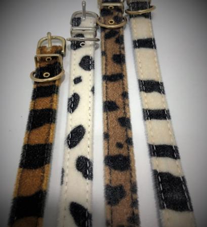 Faux-Fur Collar The latest style in faux-fur collars. Our collars feature the highest grade faux-fur fabric, combined with quality stainless steel to give you a gorgeous and lasting product. A signature item for a sophisticated dog. Styles : Cheetah, Leopard, Cougar and Zebra. INDICATE CHOICE IN ADDITIONAL COMMENTS ON THE ORDER FORM. Sizes : 10″ to 26″